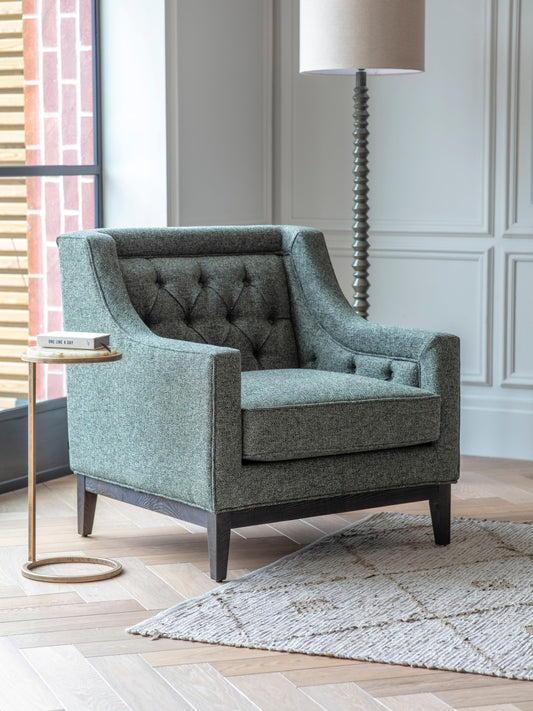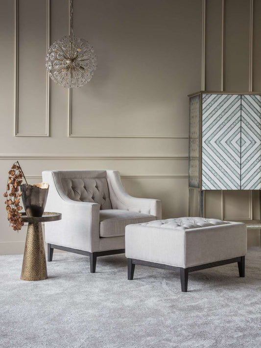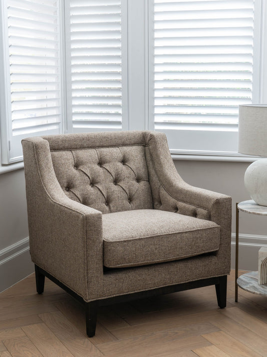 Theodore Buttoned Armchair in Warm Grey Fabric