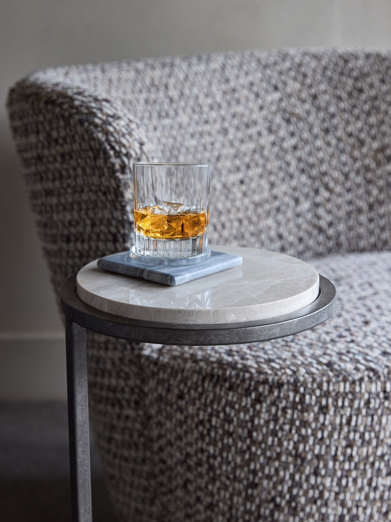 A stylish continuation of our popular Iota range, this round accent table is defined by bold materiality and refined form. Its compact top in cool-toned Italian Grey Emperador marble is elevated by an aged silver iron frame, offering subtle elegance. A sculptural base detail adds a retro touch, perfect for layered, contemporary interiors.26 x 26 x 59cm.The Iota collection also features a wide selection of finishes including Black Marble, Brown Emperador, Forest Brown, White Banswara, Green Onyx, and two elegant oval styles.