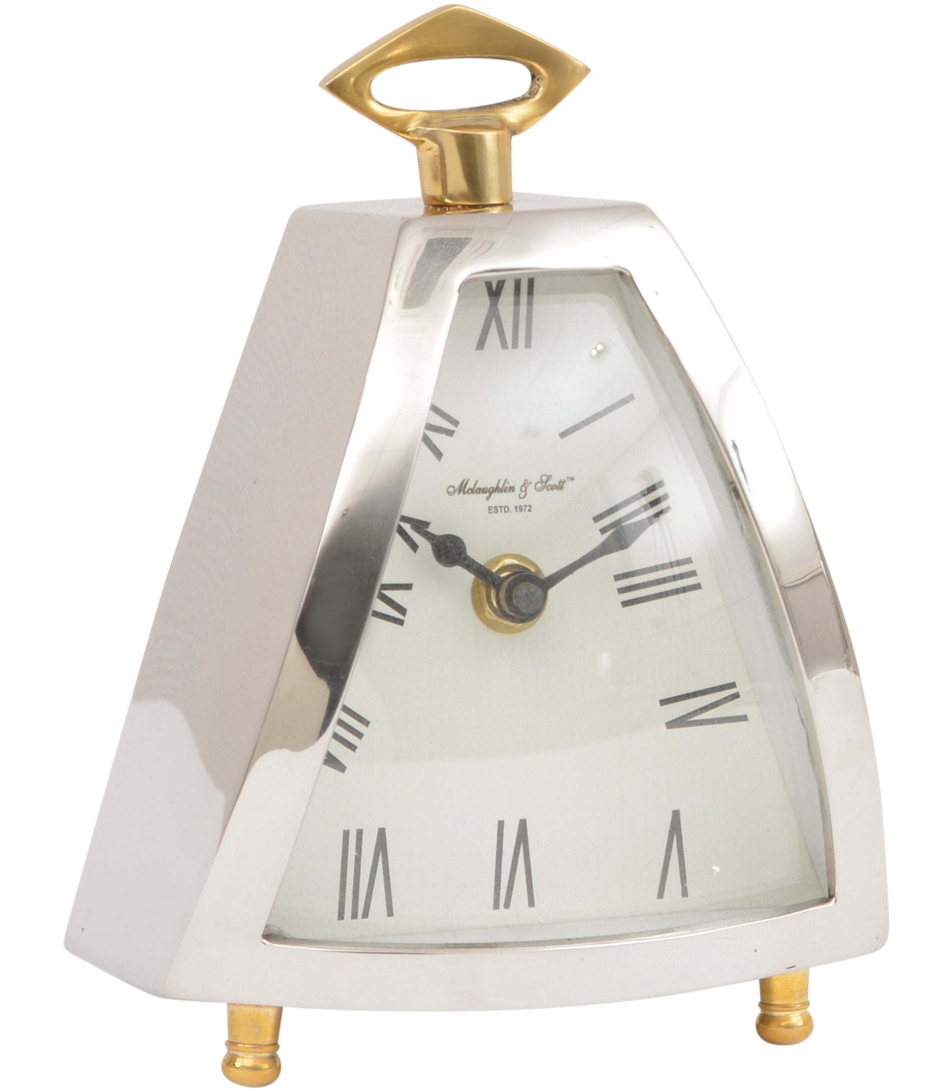 Curved front mantel clock in polished nickel finish with brass fittings and a black leather handle, roman numerals brass feet.