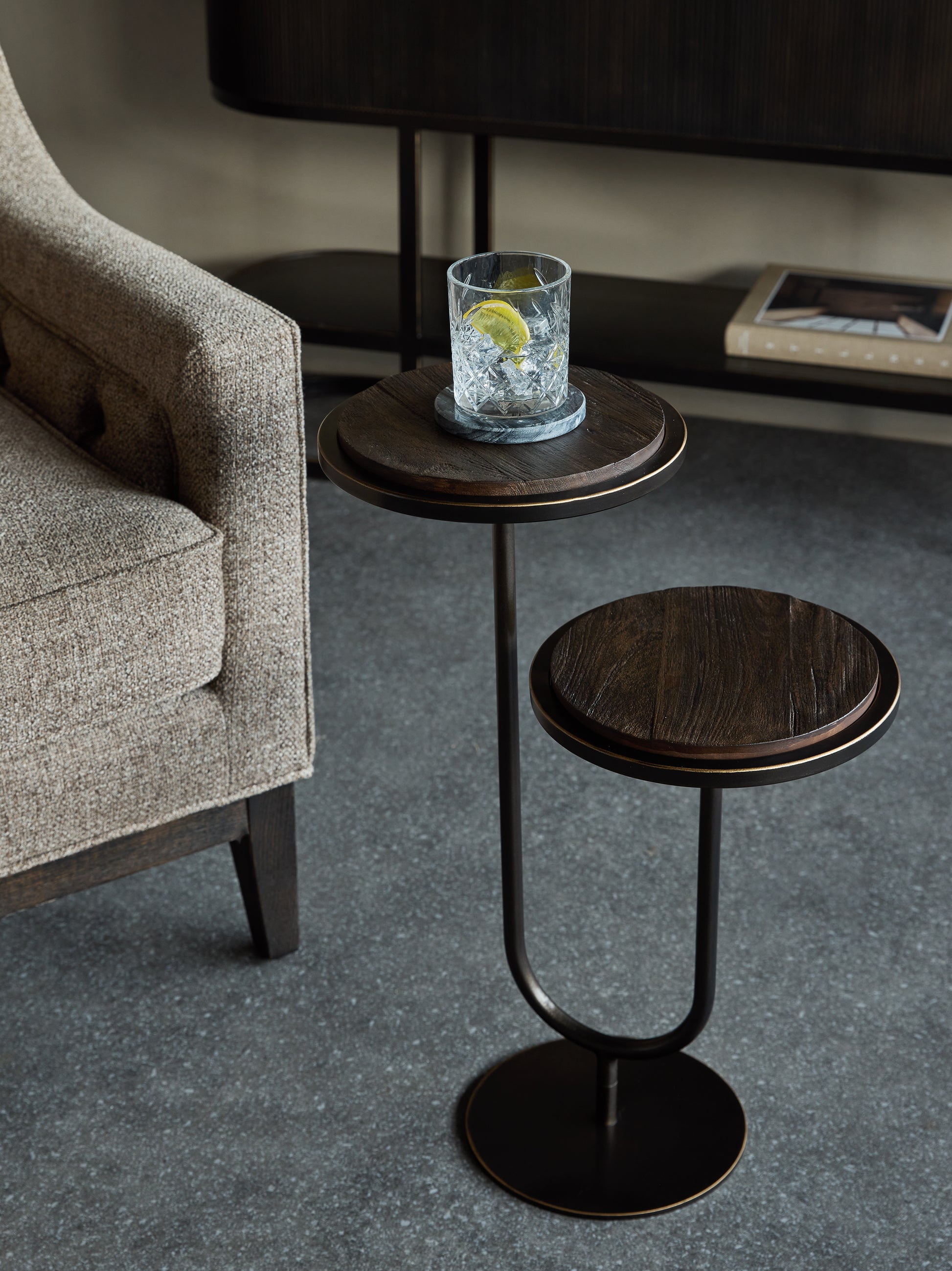 The Marco Accent Table in Sandblasted Walnut features a refined dual-tier design with coordinating circular tops crafted from mango wood in a rich sandblasted walnut finish, supported by a sleek gilded dark bronze iron frame. The natural grain variations in the mango wood make each piece unique, adding character and individuality to its design. Exclusive to the Libra Retail channel, this versatile piece is ideal for showcasing decorative accents or serving as a stylish side table. Also available in White Banswara Marble, Forest Brown Marble, and Dark Brown Emperador for varied styling options. Dimensions: W26 × D42 × H59 cm.