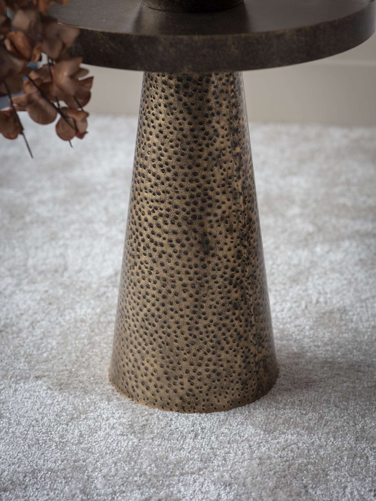 The Sandbanks Side Table is made in made in a mix of Antique and Rustic bronze and gold finishes, using traditional hand finishing techniques. The table has a thick frame round the circular table top, and sits on a conical base with a beautiful hammered effect. Part of our wider Sandbanks collection of lighting and furniture.